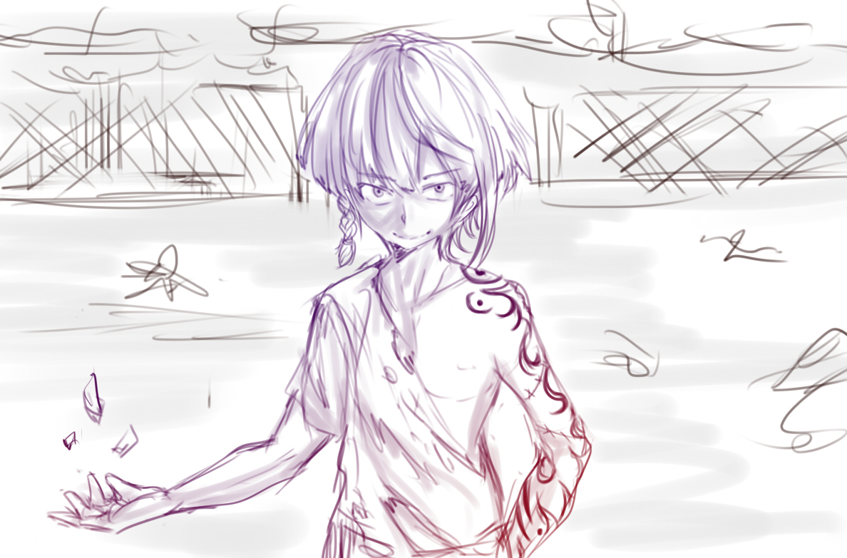 破られた日常と慇懃無礼な少年。全くデザインを決めてなかったので友人に考えてもらいました。ちなみに魔装は、異能の開示とは違い、相手に見せつけても性能が上がることはありません。